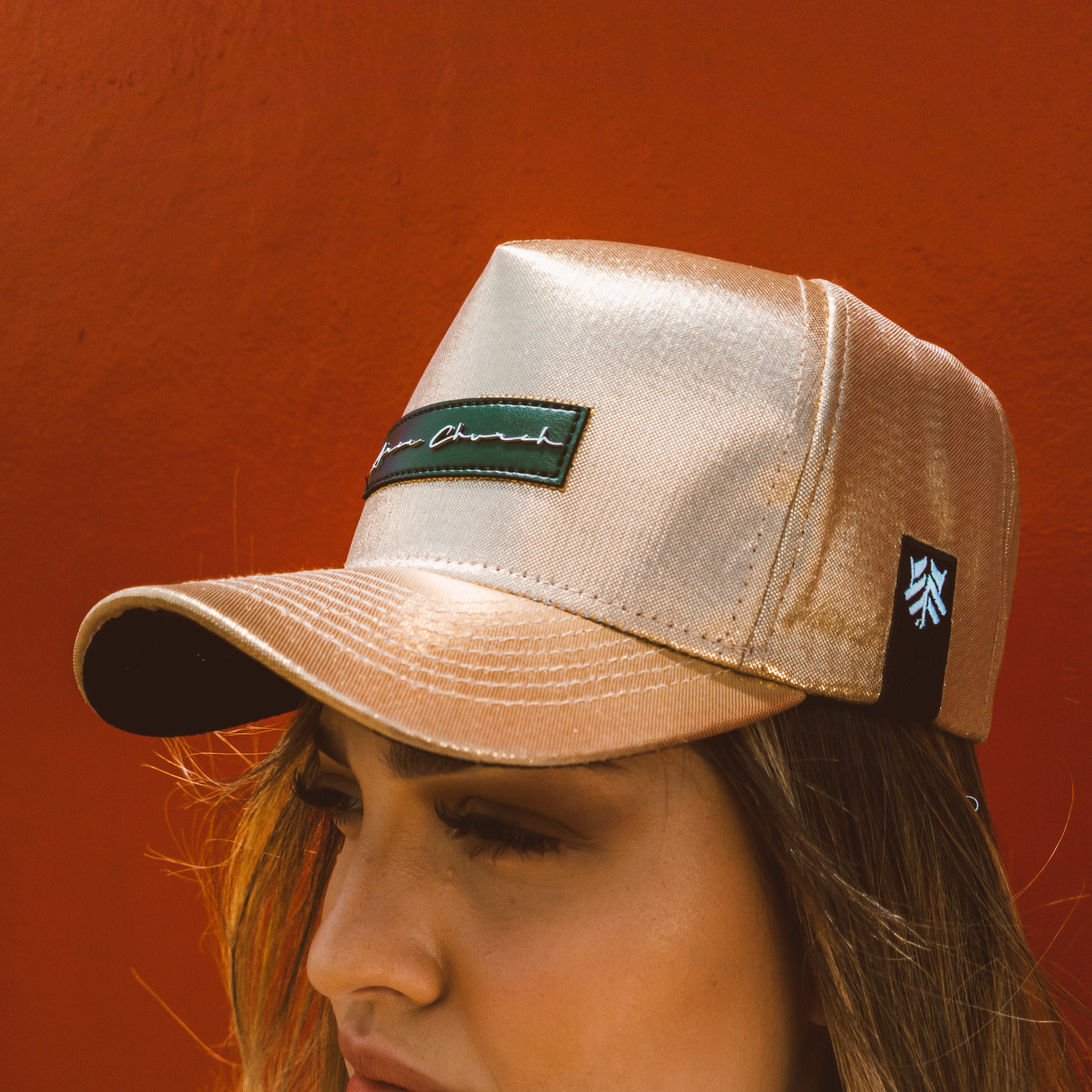 Boné com aplicação emborrachada, couro, no tecido gold e forrado por dentro.